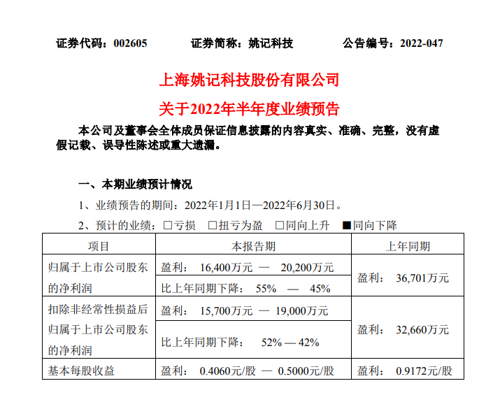 近日,姚记科技发布2022年半年度业绩预告,预计2022年上半年归属于上市公司股东的净利润为1.64亿—2.02亿元,同比下降45%—55%。扣除非经常性损益后归属于上市公司股东的净利润为1.57亿—1.90亿元,同比下降42%—52%。