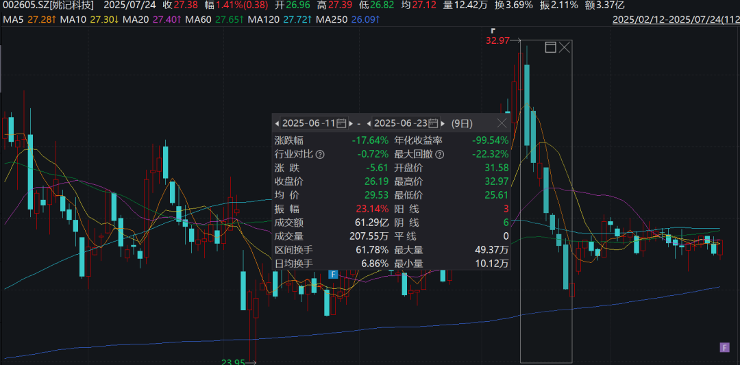 事实上,这并非今年控股股东首次减持股份。早在2025年6月11日,公司便披露姚朔斌、姚晓丽与姚文琛等人合计减持170万股,占总股本约1.01%。其中,泰润基金清仓减持70万股,阿巴马基金则减持100万股。减持消息发布后,姚记科技股价从6月11日的32.97元跌至6月23日的26.19元,累计跌幅超过17%。此次再次抛出减持计划,或将引发市场对公司未来经营预期的进一步担忧。