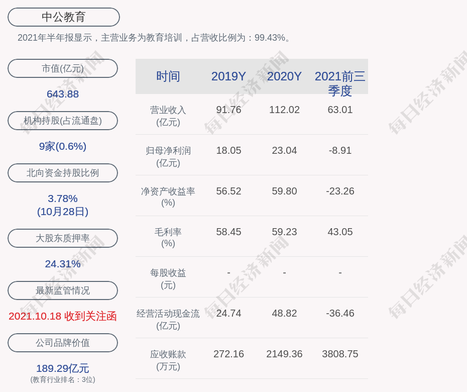2021年半年报显示,中公教育的主营业务为教育培训,占营收比例为:99.43%。