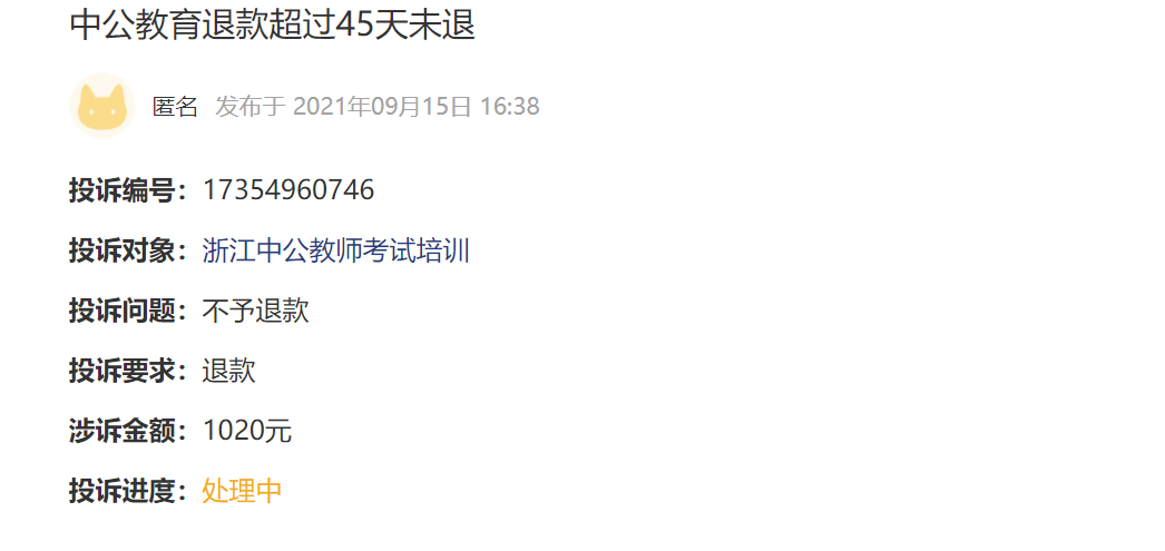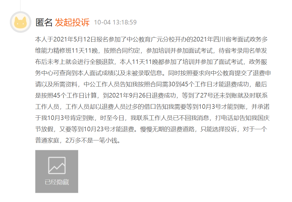 有学员发起投诉称,“本人其于2021年5月12日报名参加了中公教育广元分校开办的2021年四川省考面试政务多维能力精修班11天11晚,按照合同约定,参加培训并参加面试考试,待省考录用名单发布后未考上就会进行全额退款,本人11天11晚都参加了培训并参加了面试考试,政务服务中心可查询到本人面试成绩以及未被录取信息。同时按照要求向中公教育提交了退费申请以及所需资料,中公工作人员告知我按照合同需30到45个工作日才能退费成功,最后是按照45个工作日计算,到2021年9月26日退费成功,等到了27号还未到账就及时联系工作人员。工作人员却以退费人员过多的借口告知我需要等到10月3号才能到账,并承诺于我10月3号肯定到账,时至今日,我联系工作人员已不回我消息,打电话却告知我国庆节放假,又要等到10月23号才能退费。”