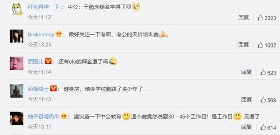 “交钱容易退费难。”有网友在微博中如此形容中公教育。今年2月,教育部门曾表示,校外培训仍然过热,超前超标培训问题尚未根本解决,一些校外培训项目收费居高,培训机构“退费难”“卷款跑路”等违法违规行为时有发生,既加重了学生的负担,又加重了家长的负担,严重破坏了教育生态。