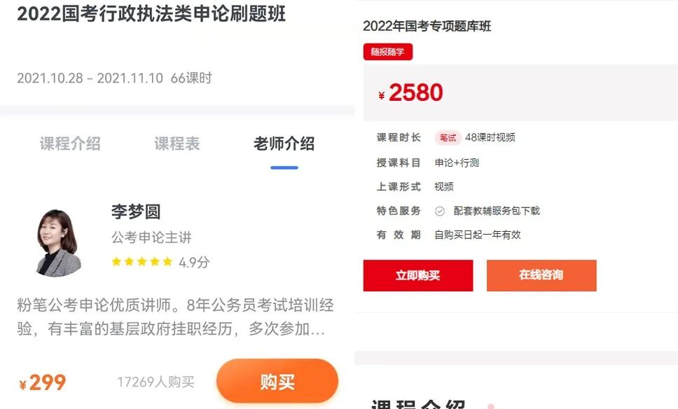 在粉笔APP上能够看到,66课时的专项直播课仅需299元,授课教师均为粉笔资深讲师,例如李梦圆,在微博上拥有超过140万粉丝,目前该课程已有近两万人报名。而在中公教育,48课时的专项直播课需要2580元,且并非“不过包退”的协议班。
