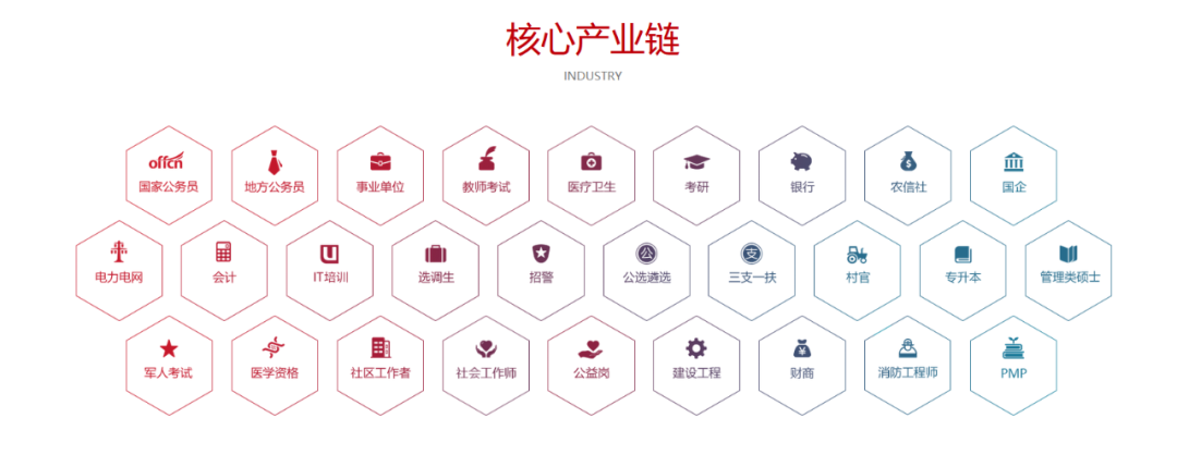 “金角”,对应招录考试序列,确保公务员、事业单位、教师和各类基层公共服务类岗位的招录及国企、银行招聘考试等招录培训项目上的压倒优势。目前该序列有几十种考试培训项目。