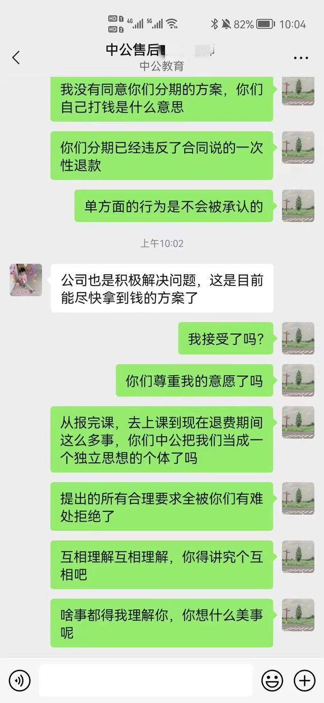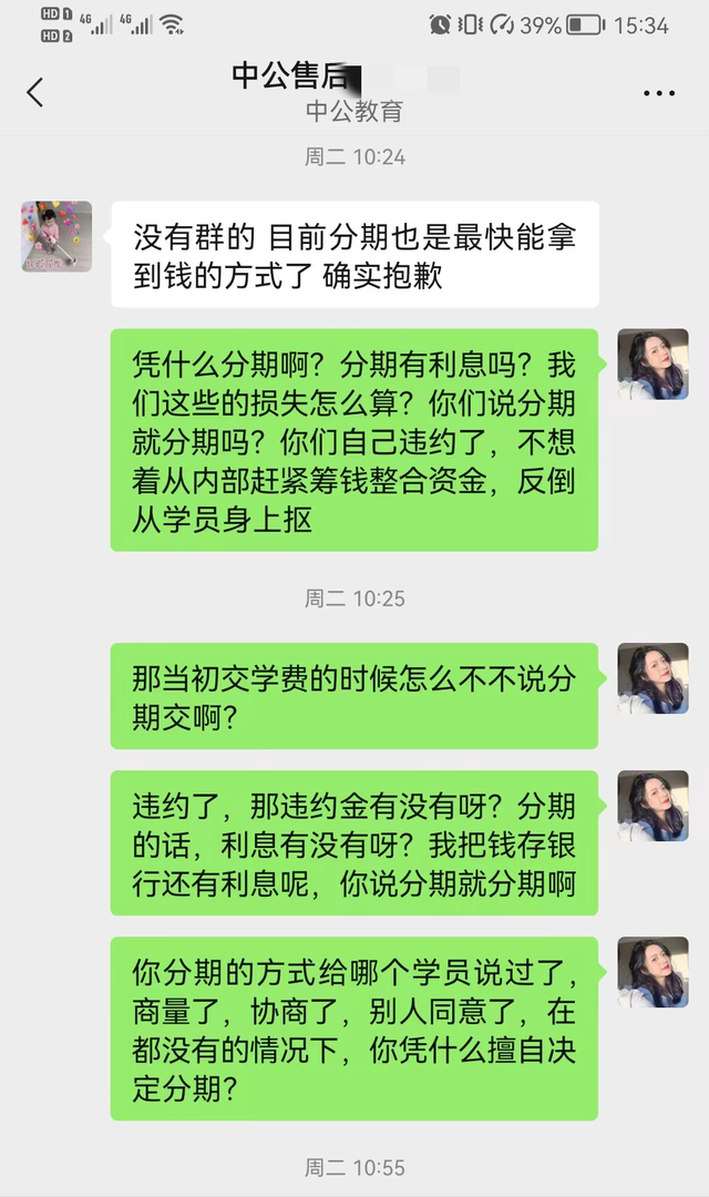 有学员表示,疫情严峻,如果真的经济困难,我们也不是不能理解,但中公教育的实际做法确实让人愤恨,一拖再拖,学员不问就不提,再问依旧推脱,实在扛不住了,一句没钱便想相安无事。甚至死猪不怕开水烫的随意学员举报、投诉。最后实在没办法,出台一个分期退费的单项规定,对自己违约失信及分期退款的费用只字不提。