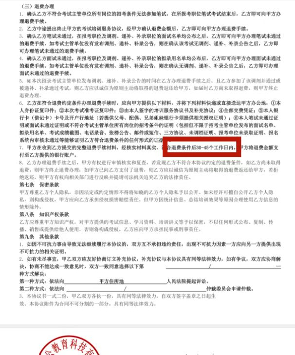 在中公与学员签署的协议中,关于退费时效的条款提到:“经审核材料真实、符合退费条件后30至45个工作日内,甲方将退费金额支付于乙方。”协议的甲方为北京中公教育科技有限公司。但目前,数以万计的学员早已超过45个工作日,却迟迟收不到早该来的退款。