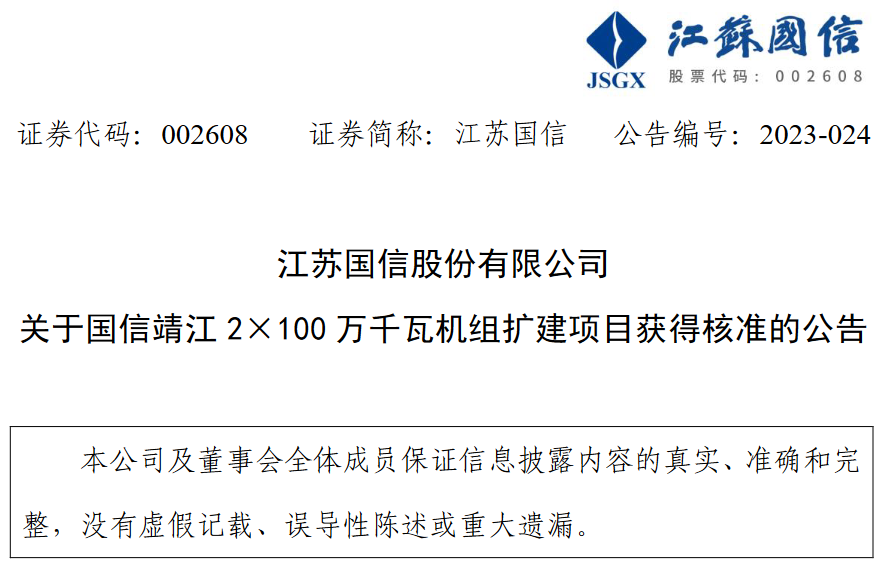 江苏国信(002608)于7月5日发布公告称,近日,江苏国信股份有限公司(以下简称“公司”)收到靖江市发展和改革委员会转发的江苏省发展和改革委员会《关于国信靖江 2×100 万千瓦机组扩建项目核准的批复》(苏发改能源发〔2023〕715号),项目代码:2304-320000-04-01-804858。核准文件主要内容如下: