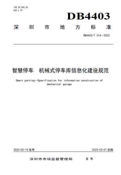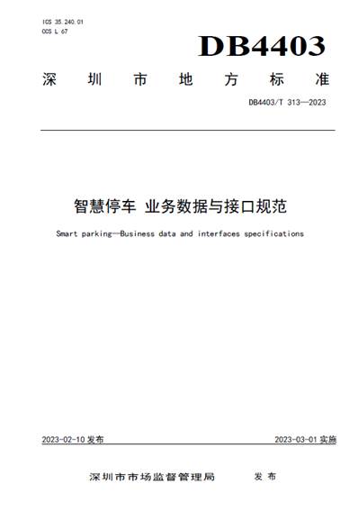 3月1日,由深圳市公安局交通警察局提出并归口、深圳市信息基础设施投资发展有限公司牵头,捷顺科技子公司顺易通和鹏城智慧共享科技(深圳)有限公司等行业企业共同编写的深圳市地方标准DB4403/T 315-2023 《停车库(场)预约共享数据接口规范》正式实施。