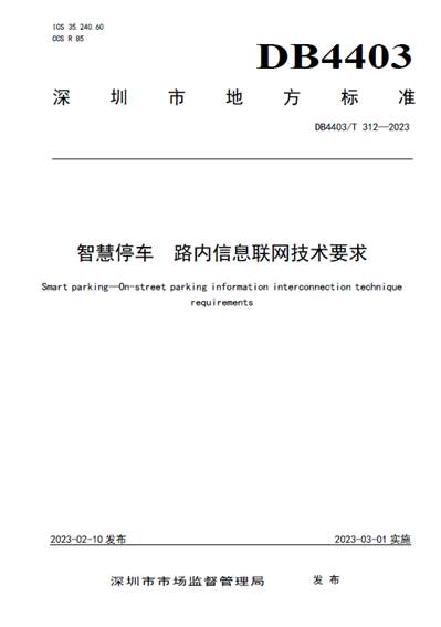 DB4403/T 312-2023《智慧停车路内信息联网技术要求》规定了智慧停车路内信息联网的系统构成、系统接口及数据定义、通信接口要求及安全要求。适用于城市停车管理平台和路内停车管理系统之间的联网通信和数据交互。