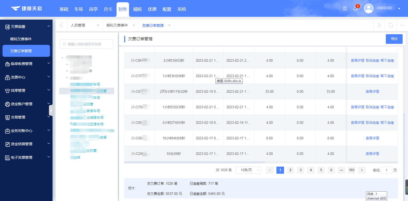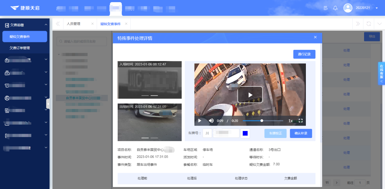 针对利用道闸防砸功能跟车入场或出场的车辆,捷顺的“超眸”智能摄像机将一一识别和记录,完成车辆通行记录的补录,形成完成的欠费订单。而对于欠费放行的车辆,捷顺的平台提供功能强大的异常稽核能力,识别出是否车主责任,以此为依据形成欠费订单。