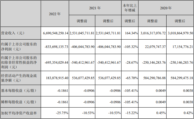 爱康科技(002610.SZ)昨日晚间披露2022年年度报告。报告期内,该公司实现营业收入66.91亿元,同比增长164.34%;实现归属于上市公司股东的净利润-8.34亿元,上年同期为-4.06亿元;实现归属于上市公司股东的扣除非经常性损益的净利润-6.95亿元,上年同期为-5.40亿元;经营活动产生的现金流量净额为1.84亿元,同比下降65.70%。