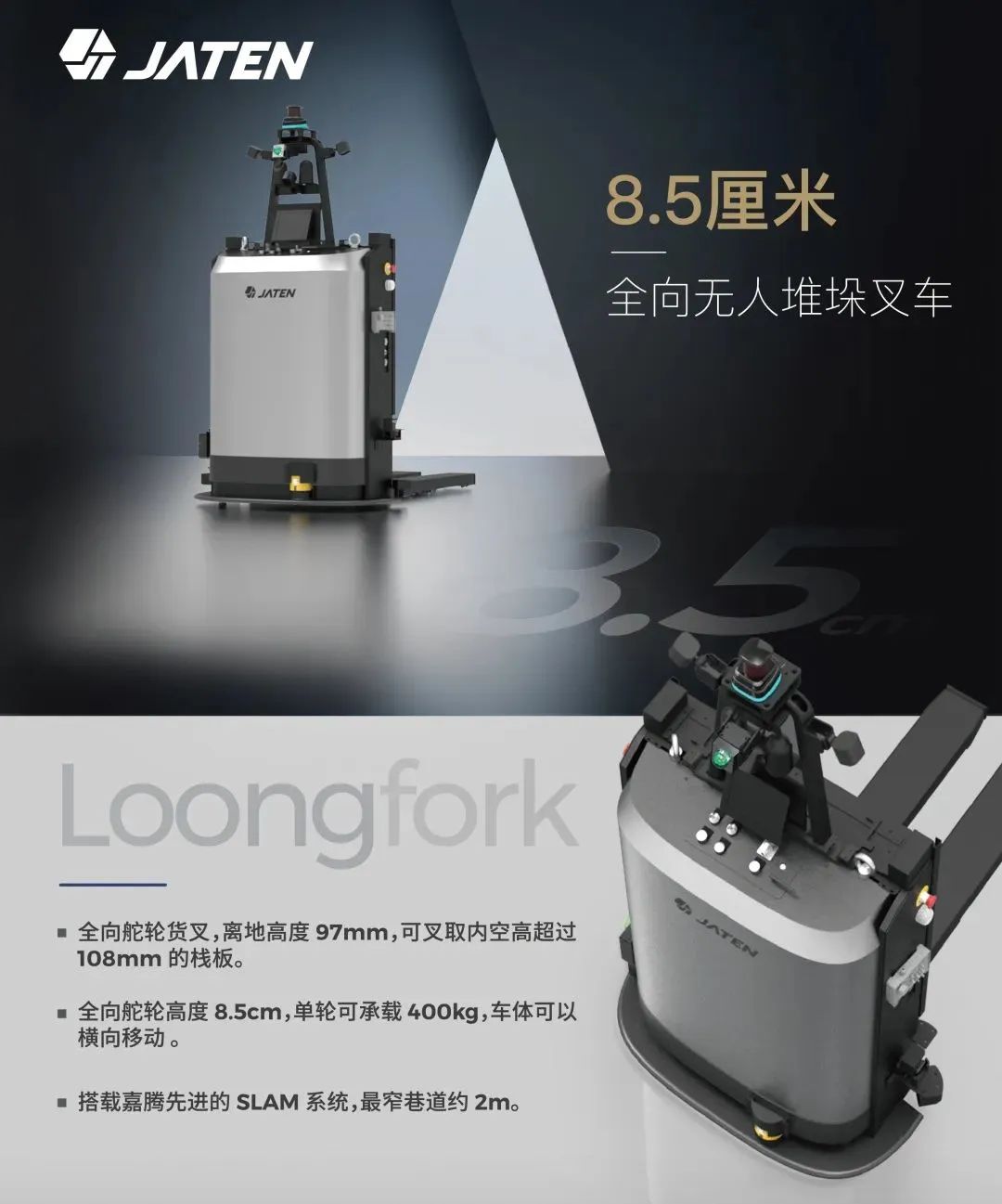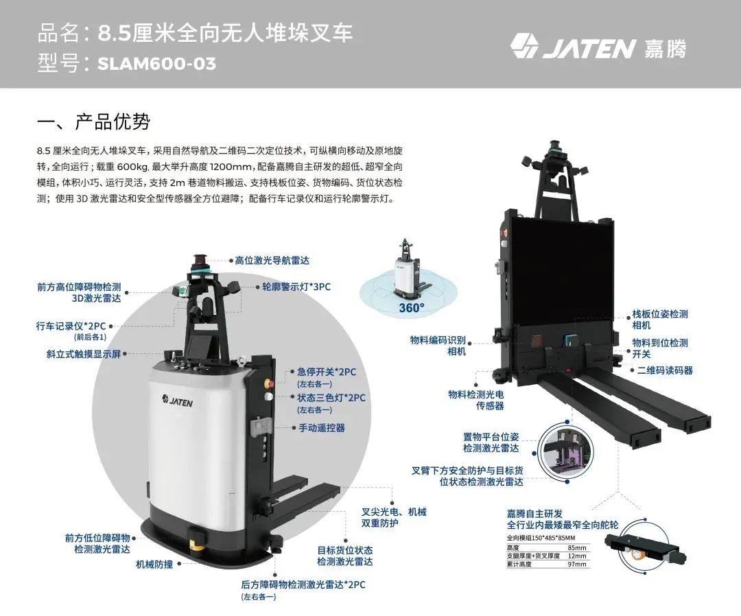 蝶变,百炼成钢新品诞生。嘉腾机器人重磅推出8.5厘米全向无人堆垛叉车,超薄超窄,灵动高效!采用自然导航及二维码二次定位技术,可纵横向移动及原地旋转,全向运行;载重600KG;最大举升高度1200mm;配备嘉腾自主研发的超低、超窄全向模组,体积小巧、运行灵活,支持2M巷道物料搬运;支持栈板位姿、货物编码、货位状态检测;使用3D 激光雷达和安全型传感器全方位避障;还配备了行车记录仪和运行轮廓警示灯,安全可靠。