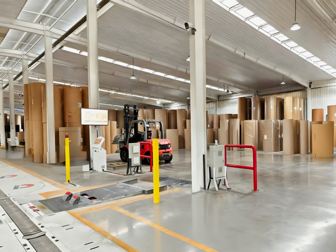 ?抱车配备平板电脑,可以实时显示纸板生产线每个原纸架当前生产用纸和计划生产用纸。抱车司机根据生产计划将合适的原纸抱到上纸位置,上纸位置的RFID读取门站会自动识别纸卷信息并同步到大屏上。纸卷信息无误后,抱车司机将纸卷放入备纸器并根据平板提示信息输入目标原纸架编号,原纸输送机便以最优路径将原纸输送到目标原纸架。
