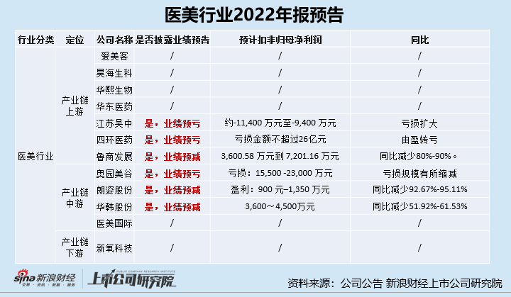 1月31日,A股2022年报预告收官,医美行业绩优与绩差上市公司揭开面纱,产业景气度一览无余。在我们所关注的医美行业上市公司中,共有6家发布了业绩预告,分别为江苏吴中、四环医药、鲁商发展、奥园美谷(维权)、朗姿股份和华韩股份。遗憾的是,这6家上市公司发布的均为业绩预亏或业绩预减公告。