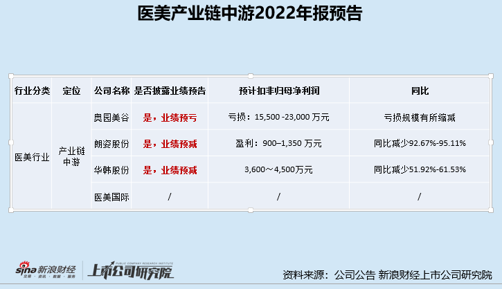 在我们选取的医美产业链中游上市公司中,有3家披露了2022全年业绩预告,有2家业绩预减超50%,分别为医疗美容机构龙头朗姿股份、华韩股份,有1家业绩预亏,即为奥园美谷。