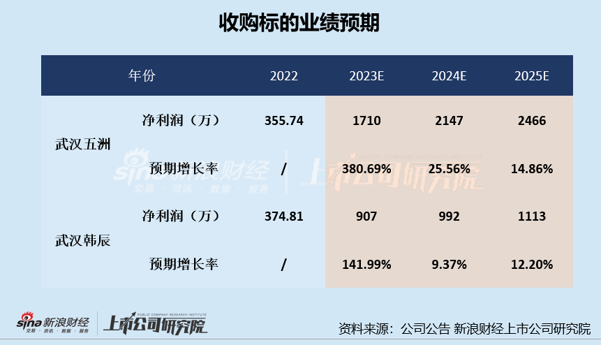 另外,从业绩预期来看,博辰八号就武汉五洲的2023年度、2024年度、2025年度净利润水平均做出业绩承诺,分别为不低于1,710万元、2,147万元及2,466万元,累计不低于6,323万元。然而,2022年武汉五洲的净利润仅为355.74万元,若要达成业绩承诺,2023年净利润增长率需达380.69%。