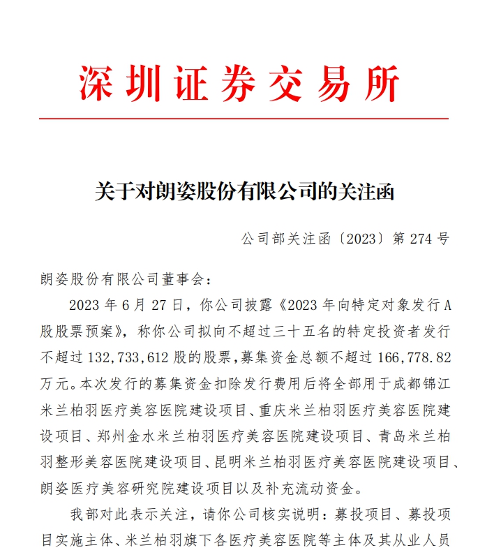 深交所28日向朗姿股份下发关注函,要求其说明募投项目是否存在虚假宣传等。