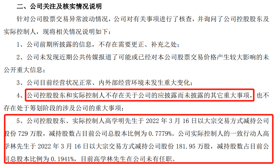 在3月17日公司发布的股价异常波动公告中,公司在说明不存在应披露而未披露的重大事项之后,又说实控人高学明在3月16日通过大宗交易减持729万、一致行动人高学林通过大宗交易减持181.95万股。