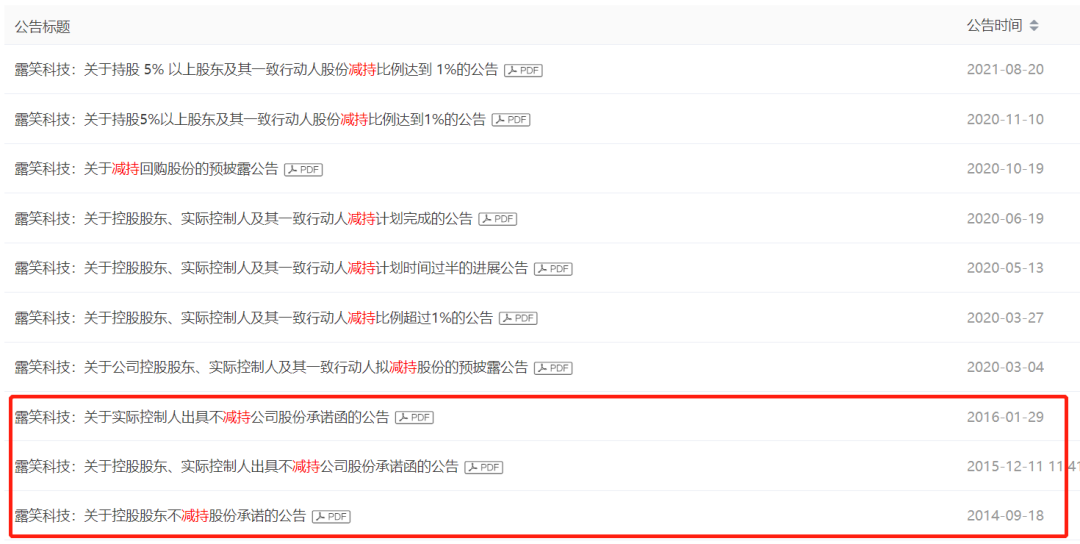 查阅露笑科技减持相关公告,公司关于减持发的公告不多,自2011年上市以来总共就10条减持公告,除了前三条是承诺不减持的,其余都是关于控股股东、实控人减持的。