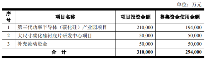 根据预案,露笑科技拟非公开发行股份总数不超过4.81亿股,募集资金总额不超过29.4亿元,扣除发行费用后将用于“第三代功率半导体(碳化硅)产业园项目”、“大尺寸碳化硅衬底片研发中心项目”和“补充流动资金”项目。