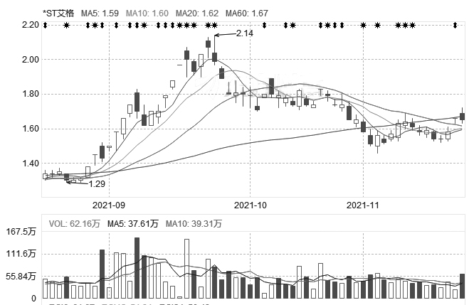 2021年11月17日晚间,*ST艾格公告当日收到证监会行政处罚及市场禁入事先告知书,公司涉嫌未在2018年中报至2020年中报五期定期报告中披露控股子公司担保事项,未在2019年报中披露关联方非经营性占用资金情况,存在重大遗漏;公司两次以虚假定期存款开户证实书入账,导致2019年报至2020年三季报四期定期报告虚增其他流动资产、虚增利润。