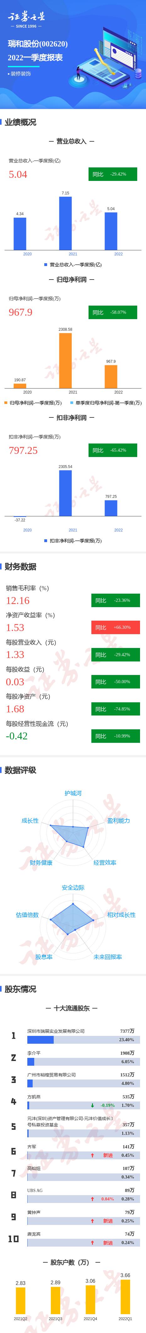 瑞和股份2022一季报显示,公司主营收入5.05亿元,同比下降29.42%;归母净利润967.9万元,同比下降58.07%;扣非净利润797.26万元,同比下降65.42%;其中2022年第一季度,公司单季度主营收入5.05亿元,同比下降29.42%;单季度归母净利润967.9万元,同比下降58.07%;单季度扣非净利润797.26万元,同比下降65.42%;负债率79.04%,投资收益-174.5万元,财务费用1042.65万元,毛利率12.16%。