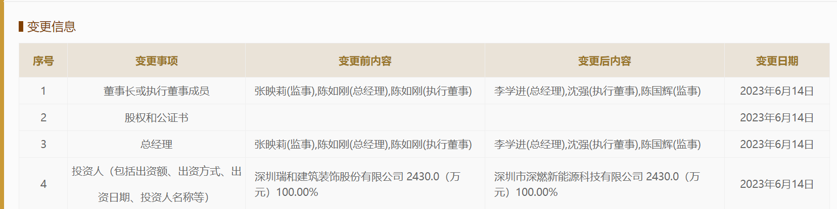 6月16日消息,深圳瑞和建筑装饰股份有限公司(以下简称“瑞和股份”)转让深圳瑞兴智慧新能源有限公司(以下简称“瑞兴智慧新能源”)100%股权予深圳市深燃新能源科技有限公司(以下简称“深燃新能源”)。