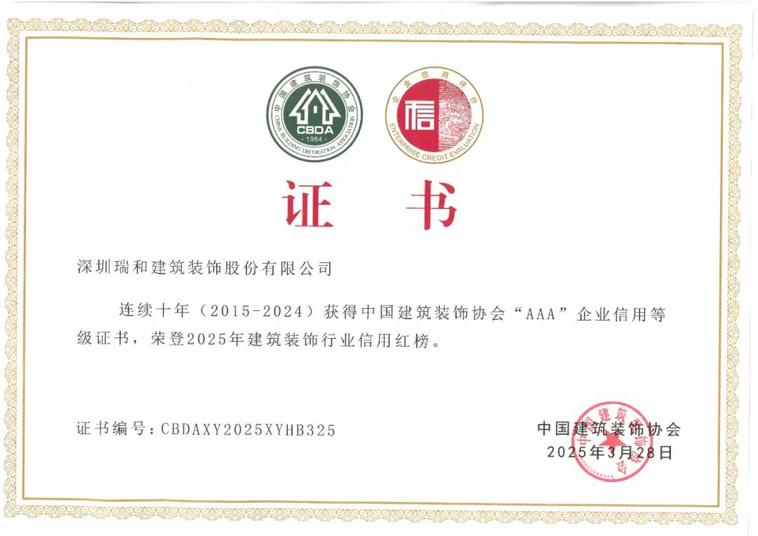 近日,深圳瑞和建筑装饰股份有限公司凭借良好的企业信誉和持续的优质服务,荣获中国建筑装饰协会颁发的“连续十年(2015-2024)AAA企业信用等级证书”,并荣登2025年建筑装饰行业信用红榜。这一荣誉不仅是对瑞和股份长期以来诚信经营、品牌塑造的高度认可,更是对公司在建筑装饰行业领域内所取得成就的有力肯定。