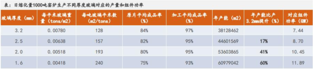 据天风证券研报的数据,玻璃厚度从3.2mm分别降到2.5mm、2.0mm和1.6mm时,理论上窑炉的玻璃产能分别可提升17%、41%和60%。假设1000吨玻璃,随着上述玻璃厚度的下降,对应组件功率从7.44GW分别增至8.7GW、10.45GW和11.89GW。光伏玻璃轻薄化势不可挡。