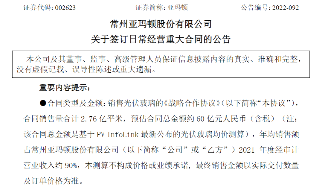 据公司情报专家《财经涂鸦》消息,12月20日晚间,亚玛顿(002623.SZ)发布关于签订日常经营重大合同的公告。亚玛顿拟于2023年1月1日起至2025年12月31日期间向晶澳科技(002459.SZ)销售光伏玻璃,预估销售量合计2.76亿平米。