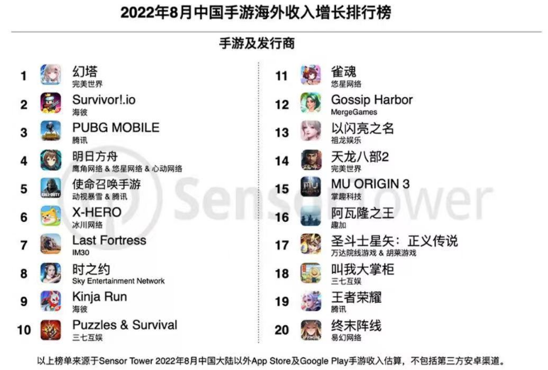 发行层面,一季度新品测试获得了良好的反馈,而已经于2021年底上线的创新产品《幻塔》在市场表现上的成功,使得人们对完美未来的前景寄予更高的期望。自2021年底上线以来,《幻塔》在2022年的中国市场表现非常稳定,成为完美最重要的业绩增长来源。2022年8月,《幻塔》在海外上线,在自主发行和部分区域授权的全球化发行结构下,取得了极为亮眼的成绩,《幻塔》也成为2022年8月,中国游戏出海产品的收入增速冠军。