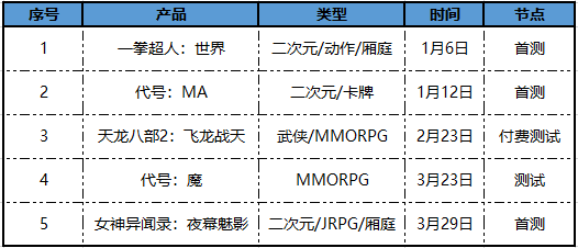 除了正在测试的《女神异闻录:夜幕魅影》之外,春节前的1月份,完美已经推出了《一拳超人:世界》和《代号:MA》两款游戏进行首次测试。同样在3月,据了解,《代号:魔》也于3月23日进行了小范围的测试,而《天龙八部2:飞龙战天》则已经完成了国内付费测试,根据官宣信息,该作将于4月14日正式公测。