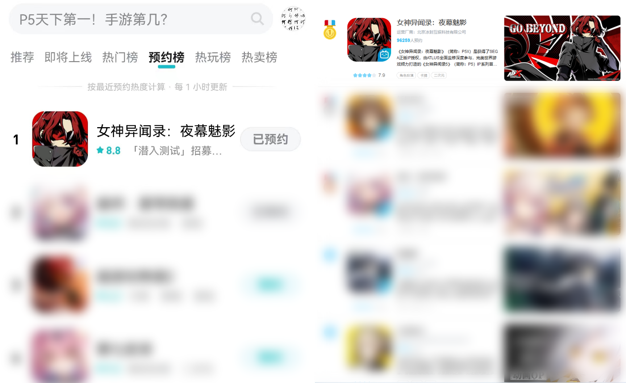 令人惊喜的是,《女神异闻录:夜幕魅影》自3月17日首次曝光并各平台开启预约后,在taptap、B站双平台登录新游预约榜第一的位置,广受玩家期待。据了解,该作源自知名日式JRPG主机游戏《女神异闻录5》的IP授权,是女神异闻录IP系列的首款手游。根据目前的资料,手游改编将忠于原作世界观的前提下,用全新的故事角色,基于P5式的“回合制战斗+角色扮演”复刻“白昼穿行校园都市,黑夜潜入殿堂改心”的双核玩法。据了解,版权方也将深度参与手游改编,主创副岛成记将亲手操刀主人公的角色设计。据透露,双方将联合研发,携手把该作推向全球市场。