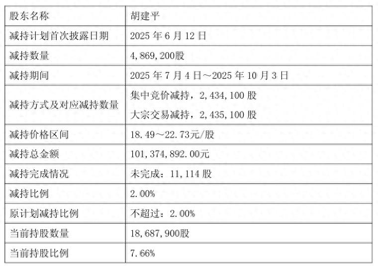 这场减持潮始于2025年7月,呈现核心主导、持续加码的特征。董事长兼CEO胡建平率先减持,7月至10月累计抛售486.92万股,套现约1.01亿元,持股比例从9.63%降至7.66%。