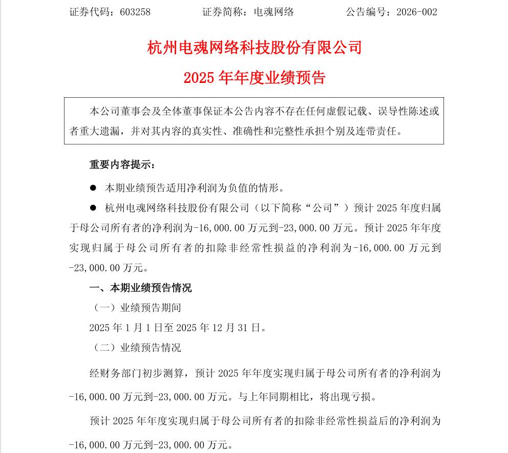 近日,A股游戏企业杭州电魂网络科技股份有限公司(603258 SH,以下简称“电魂网络”)披露2025年业绩预告,预计归母净利润亏损1.6亿至2.3亿元,创下上市以来最差业绩。比巨亏更引市场热议的,是核心管理层在公司业绩探底、转型关键期的密集减持,半年套现超2亿元,虽以“自身资金需求”为由,却引发投资者对公司前景的强烈担忧。