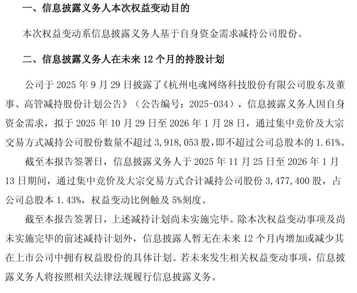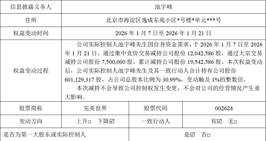 完美世界实控人池宇峰于2025年11月28日披露减持预披露公告,拟因自身资金需求减持不超公司总股本1.70%的股份,该计划于2026年1月正式落地实施。本次减持分两笔完成,1月5日池宇峰通过集中竞价、大宗交易合计减持686万股,占总股本0.35%,其及一致行动人持股比例从32.35%降至31.99%。1月7日至21日,其再度通过两种方式减持1954.26万股,占总股本1.00%,持股比例进一步降至30.99%。两笔减持合计2640.26万股,合计套现数亿元。