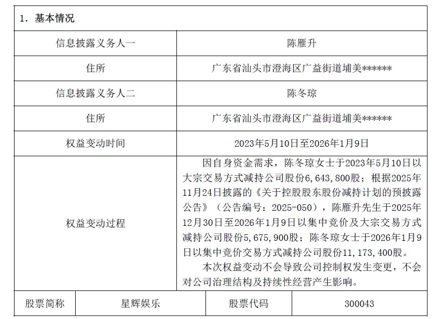 值得一提的是,近期多家A股游戏公司实控人、大股东减持。2025年11月24日,星辉娱乐(300043 SZ)披露实控人陈雁升及其一致行动人陈冬琼的减持计划,两人拟于2025年12月16日至2026年3月15日,以集中竞价或大宗交易合计减持公司不超3600.31万股股份,占总股本2.90%,其中陈雁升拟减持2%、陈冬琼拟减持0.90%,减持原因为个人资金需求。该计划落地后,陈雁升于2025年12月30日至2026年1月9日减持567.59万股,均价6.01元,套现约3411.22万元;陈冬琼于2026年1月9日减持1117.34万股,均价6.25元,套现约6983.38万元。两人合计减持1684.93万股,套现超1亿元。