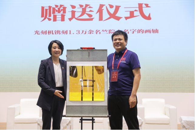 在庆典上,光启技术董事长刘若鹏博士作为杰出校友代表,向母校赠送了一份意义非凡的礼物——一幅利用光刻技术制作的院徽画轴。这幅画轴将竺可桢学院自建校以来13000余名师生的名字镌刻其上,与复杂的电路图案交织,形成了一幅既充满纪念意义又彰显科技感的艺术作品。这不仅是刘若鹏博士对母校最真挚的感谢与祝福,也寄托了他对后来者继续秉承“求是”精神、勇攀科学高峰的殷切期望。