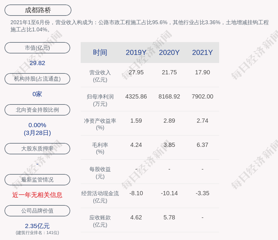 成都路桥(SZ 002628,收盘价:3.93元)3月29日晚间发布年度业绩报告称,2021年营业收入约17.9亿元,同比减少17.72%;归属于上市公司股东的净利润盈利约7902万元,同比减少3.27%;基本每股收益盈利0.1元,同比减少9.09%。