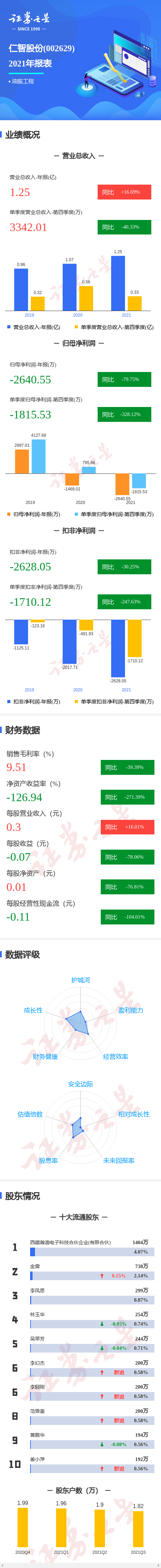 仁智股份2021年报显示,公司主营收入1.26亿元,同比上升16.69%;归母净利润-2640.55万元,同比下降79.75%;扣非净利润-2628.05万元,同比下降30.25%;其中2021年第四季度,公司单季度主营收入3342.01万元,同比下降40.33%;单季度归母净利润-1815.54万元,同比下降328.12%;单季度扣非净利润-1710.12万元,同比下降247.63%;负债率98.11%,财务费用477.38万元,毛利率9.51%。