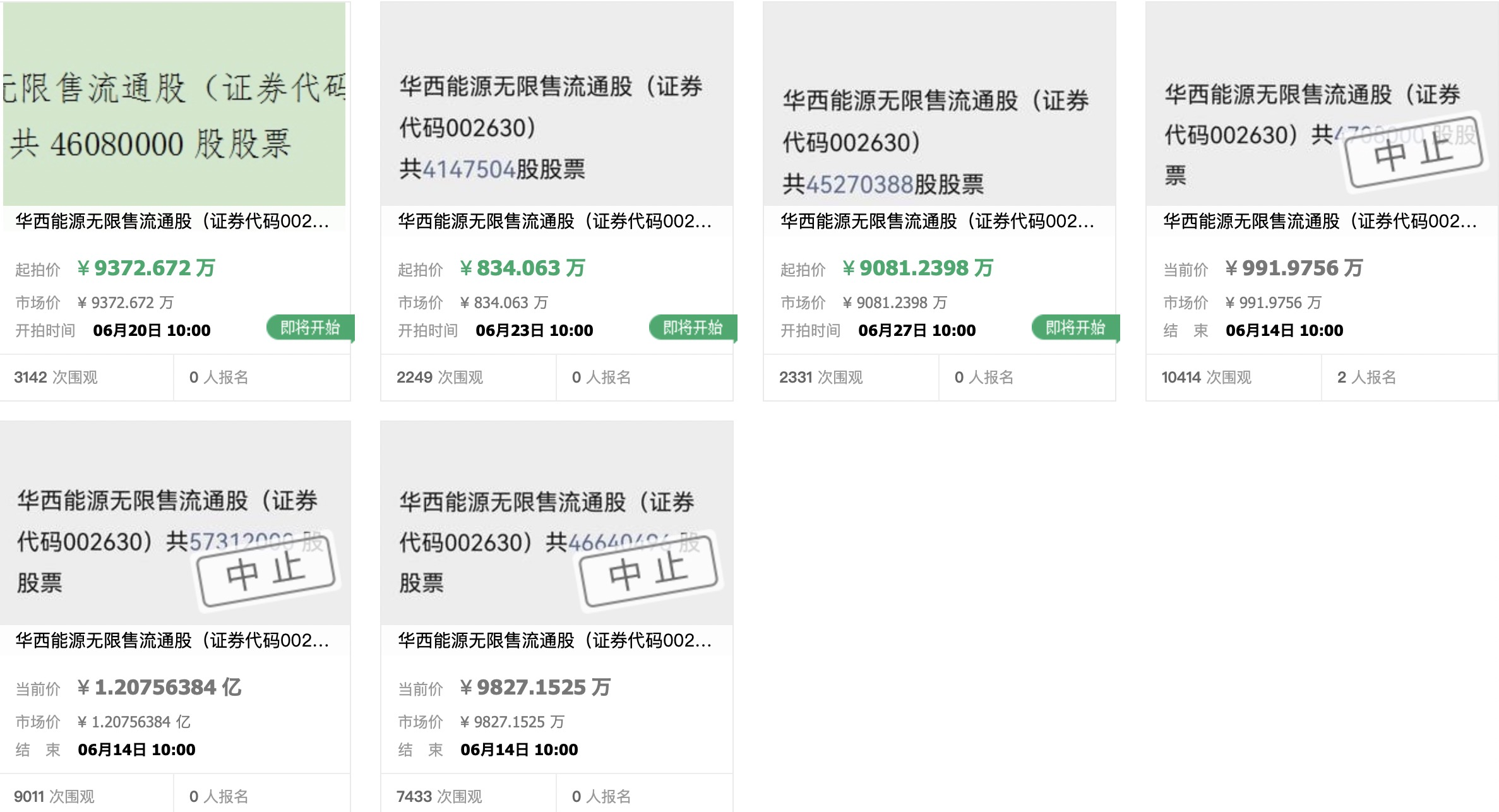 根据淘宝拍卖平台信息,黎仁超持有的华西能源4608万股、414.75万股、4527.04万股股票将分别于6月20日、23日、27日开始在该平台拍卖,拍卖股份合计9549.79万股;另有3场原本定于6月13日-14日进行的股权拍卖(合计10866.05万股)显示为“中止”,理由为“双方当事人在执行和解中,黎仁超已向申请执行人履行部分债务,为防止超标的处置,故申请暂缓拍卖。”