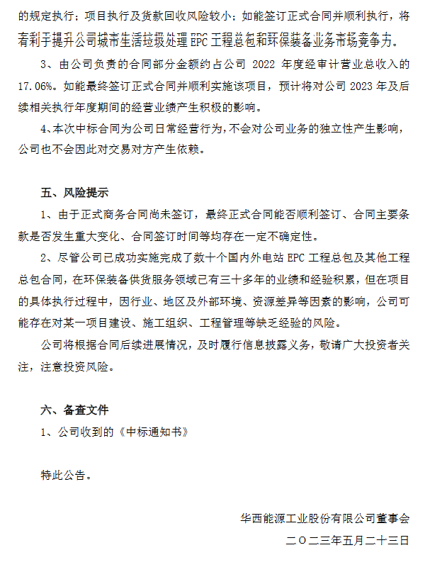 华西能源公布,公司于2023年5月22日收到武汉市绿色环保能源有限公司、武汉宗睿达工程咨询有限公司发出的中标通知书,确定公司(与中冶南方都市环保工程技术股份有限公司、浙江省二建建设集团有限公司组成的联合体)为“武汉城市生活垃圾分类资源化预处理项目(含长山口厨余垃圾焚烧协同处理工程项目)设计采购施工总承包(EPC)”的中标单位,合同总金额3.8879亿元。