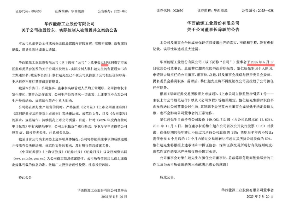 当日午间公告显示,公司于5月17日收到黎仁超的书面辞职报告。因个人原因,黎仁超申请辞去公司董事长、总裁等全部职务。晚间公告则披露,黎仁超已被留置和立案调查。ST华西还表示,黎仁超已不在公司及控股子公司担任任何职务,不承担亦不履行董事或高管职责。