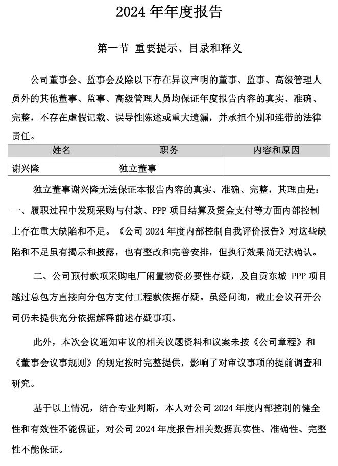 此外,公司独立董事谢兴隆也表示,“本人对公司2024年度内部控制的健全性和有效性不能保证,对公司2024年度报告相关数据真实性、准确性、完整性不能保证。”
