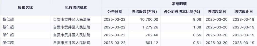 记者还注意到,仅3月20日,黎仁超合计持有的11.3%ST华西股份均被司法冻结。