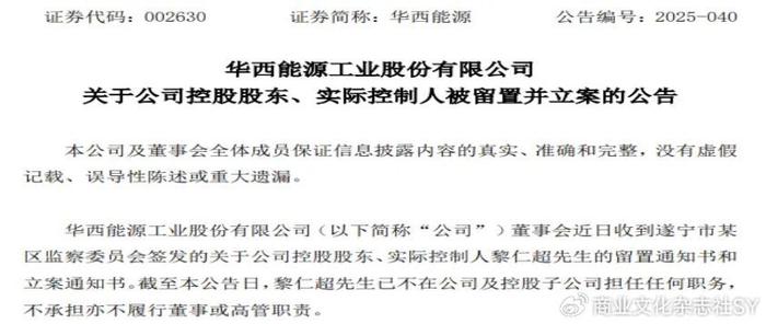 5月20日晚间,ST华西(002630.SZ)发布重磅公告,公司董事会收到遂宁市某区监察委员会签发的留置通知书和立案通知书,控股股东、实际控制人黎仁超因涉嫌严重违法被采取留置措施。这一消息距其5月17日闪电辞去董事长、总裁职务仅过去三天,标志着这家连续五年亏损的老牌装备制造企业陷入前所未有的治理危机。
