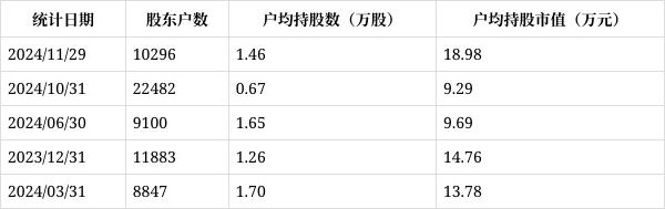 从12月3日公开信息显示,申科股份截至2024年11月29日公司股东户数为1.03万户,较上期(2024年10月31日)减少1.22万户,降幅为54.20%,持股趋于集中。