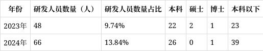 研发人员数量从2023年的48人增加到2024年的66人,增长37.50%,占员工总数比例从9.74%提升至13.84%。本科以下学历人员增长明显,达69.57%,这为公司的技术创新提供了人力支持。