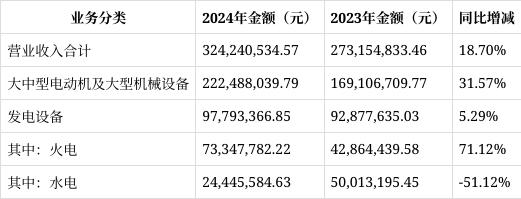 报告显示,申科股份2024年营业收入为324,240,534.57元,较上年的273,154,833.46元增长了18.70%。这一增长表明公司在市场拓展方面取得了一定成效。从业务板块来看,大中型电动机及大型机械设备业务收入为222,488,039.79元,占营业收入比重68.62%,较上年增长31.57%;发电设备业务收入97,793,366.85元,占比29.98%,其中火电业务增长显著,同比增长71.12%,水电业务则下降51.12%。