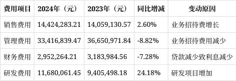 销售费用:2024年销售费用为14,424,283.21元,较上年的14,059,130.57元增长2.60%,主要因业务招待费增长所致。这或许是公司为进一步拓展市场,加大了业务推广力度。