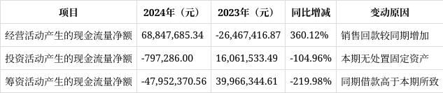 经营活动现金流:经营活动产生的现金流量净额为68,847,685.34元,上年为-26,467,416.87元,增长360.12%,主要是销售回款较同期增加。这表明公司经营活动的现金创造能力大幅提升,经营状况良好。